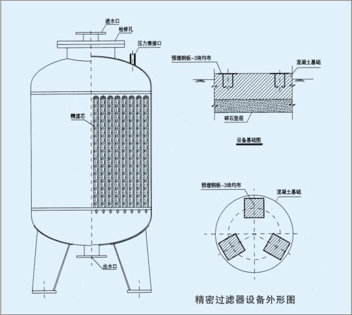 精密過(guò)濾器(又稱作保安過(guò)濾器),簡(jiǎn)體外殼一般采用不銹鋼材質(zhì)制造,內(nèi)部采用PP熔噴、線燒、折疊、鈦濾芯、活性炭濾芯等管狀濾芯作為過(guò)濾元件,根據(jù)不同的過(guò)濾介質(zhì)及設(shè)計(jì)工藝選擇不同的過(guò)濾元件,以達(dá)到出水水質(zhì)的要求。機(jī)體也可選用快裝式,以方便快捷的更換濾芯及清洗。