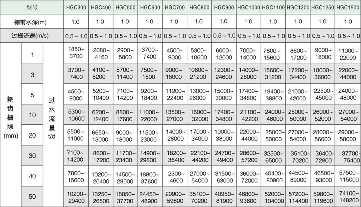 過水流量表(并聯(lián)機(jī)的過水量按此型號(hào)乘2即得)